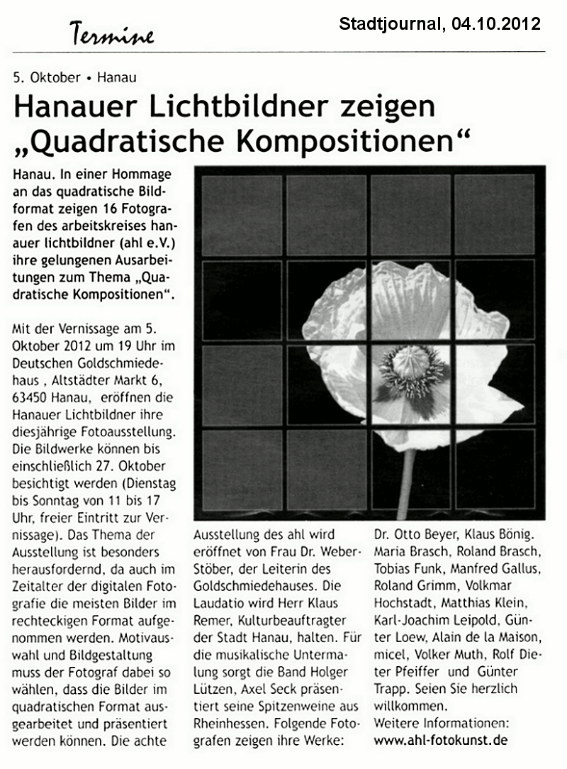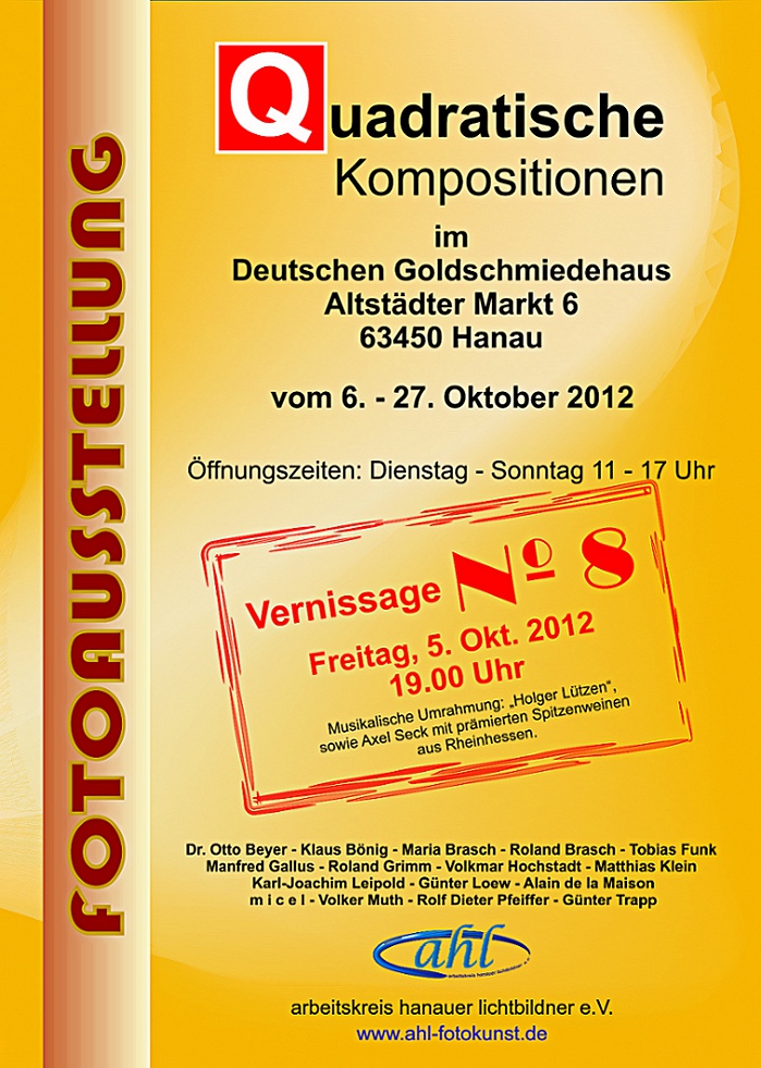 In einer Hommage an das quadratische Bildformat zeigen 16 Fotografen des arbeitskreises hanauer lichtbildner (ahl e.V.) ihre gelungenen Ausarbeitungen zum Thema "Quadratische Kompositionen". Mit der Vernissage am 5. Oktober 2012 um 19 h im Deutschen Goldschmiedehaus, Altstädter Markt 6, 63450 Hanau, eröffnen die Hanauer Lichtbildner ihre diesjährige Fotoausstellung.